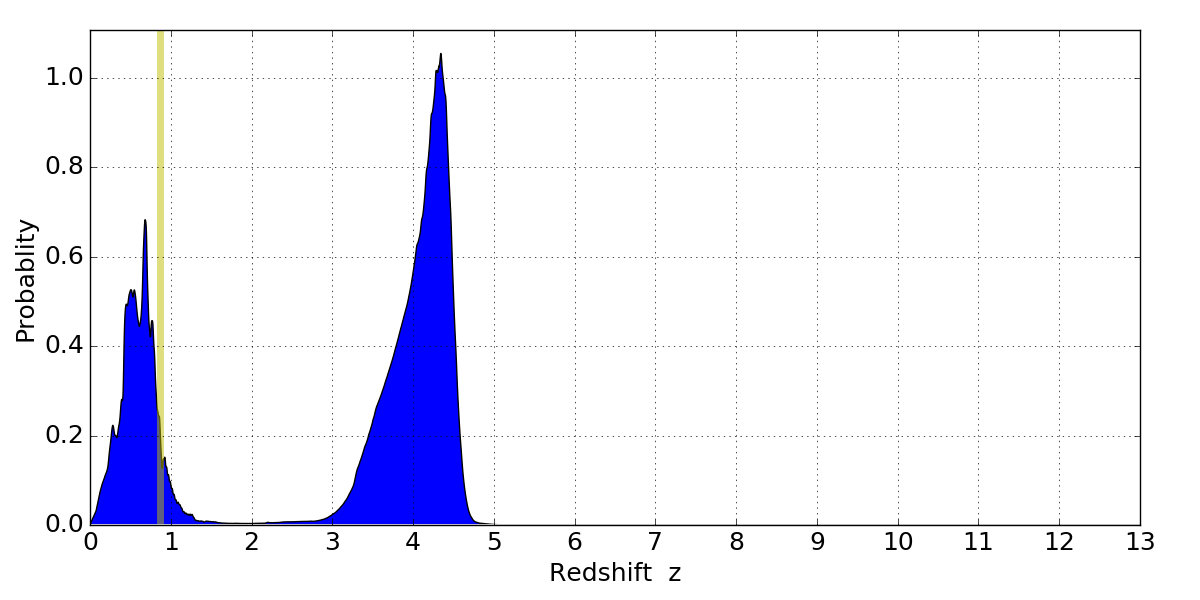In P(z) plots: Yellow lines mark the cluster redshift z = 0.870,