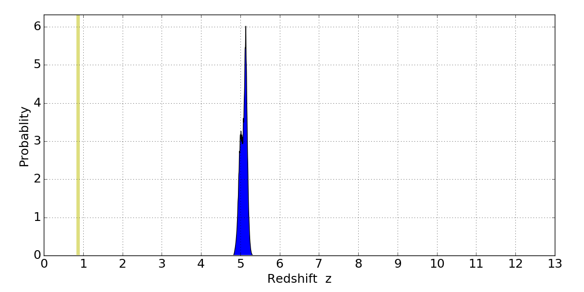 In P(z) plots: Yellow lines mark the cluster redshift z = 0.870,