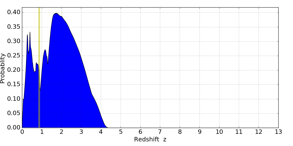 In P(z) plots: Yellow lines mark the cluster redshift z = 0.870,