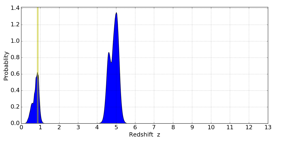 In P(z) plots: Yellow lines mark the cluster redshift z = 0.870,