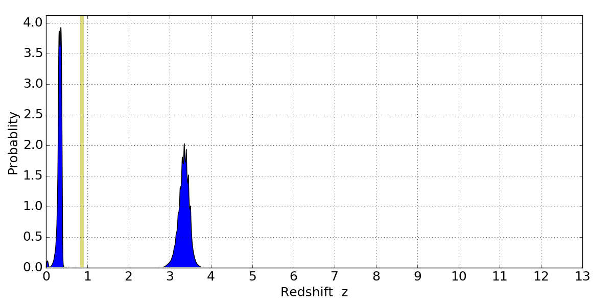 In P(z) plots: Yellow lines mark the cluster redshift z = 0.870,