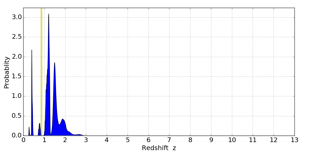 In P(z) plots: Yellow lines mark the cluster redshift z = 0.870,