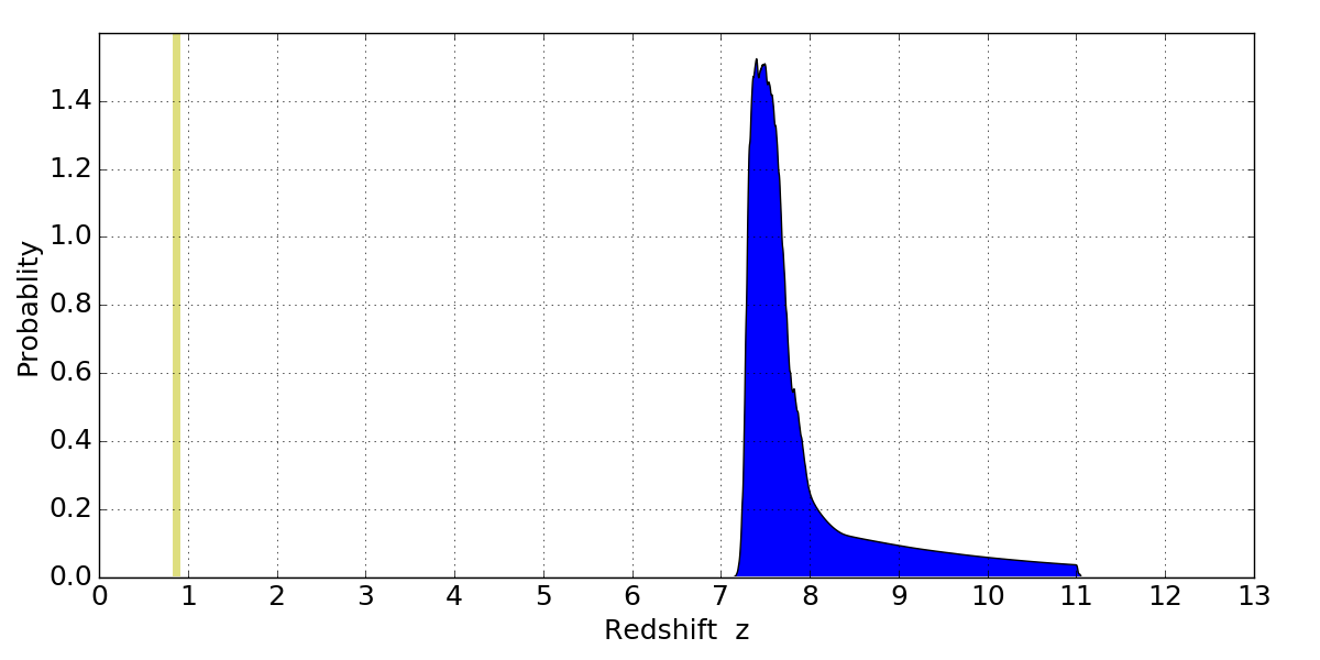 In P(z) plots: Yellow lines mark the cluster redshift z = 0.870,