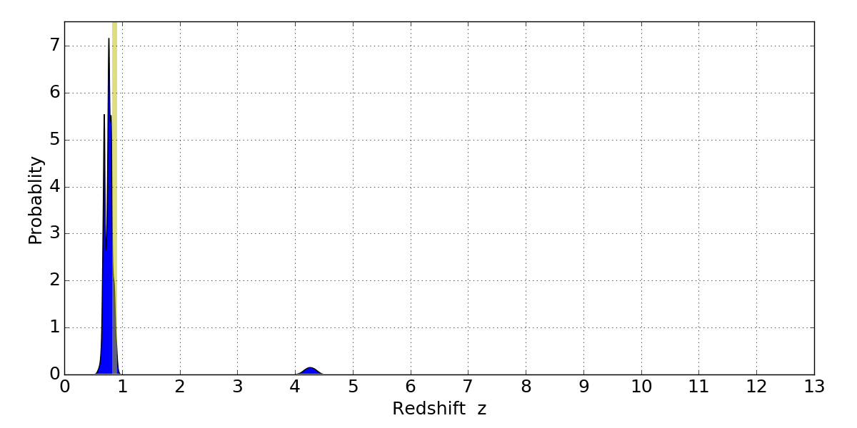In P(z) plots: Yellow lines mark the cluster redshift z = 0.870,