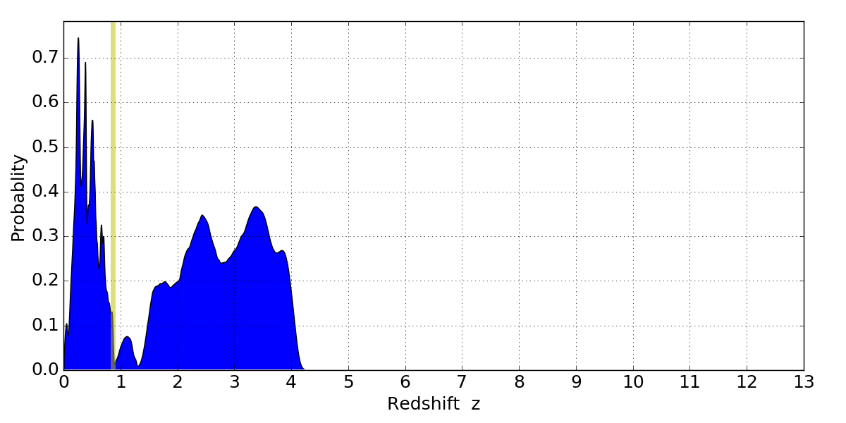 In P(z) plots: Yellow lines mark the cluster redshift z = 0.870,