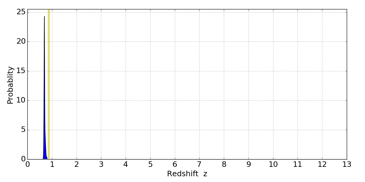 In P(z) plots: Yellow lines mark the cluster redshift z = 0.870,