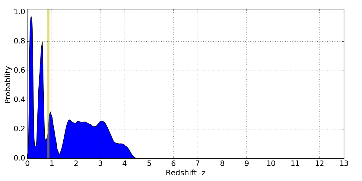In P(z) plots: Yellow lines mark the cluster redshift z = 0.870,