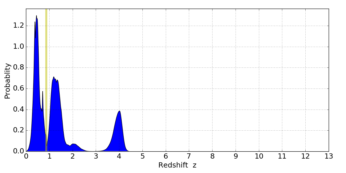 In P(z) plots: Yellow lines mark the cluster redshift z = 0.870,