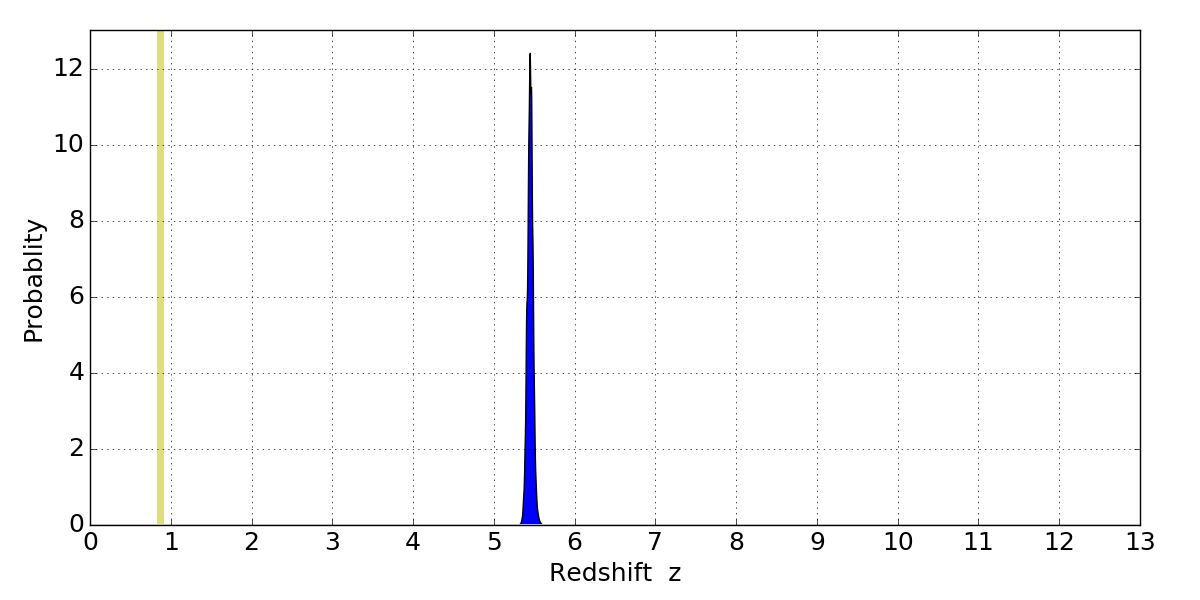 In P(z) plots: Yellow lines mark the cluster redshift z = 0.870,