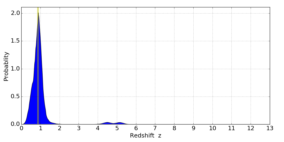 In P(z) plots: Yellow lines mark the cluster redshift z = 0.870,