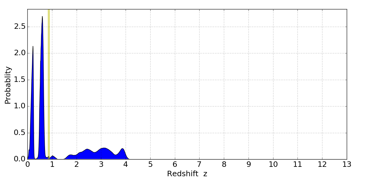 In P(z) plots: Yellow lines mark the cluster redshift z = 0.870,