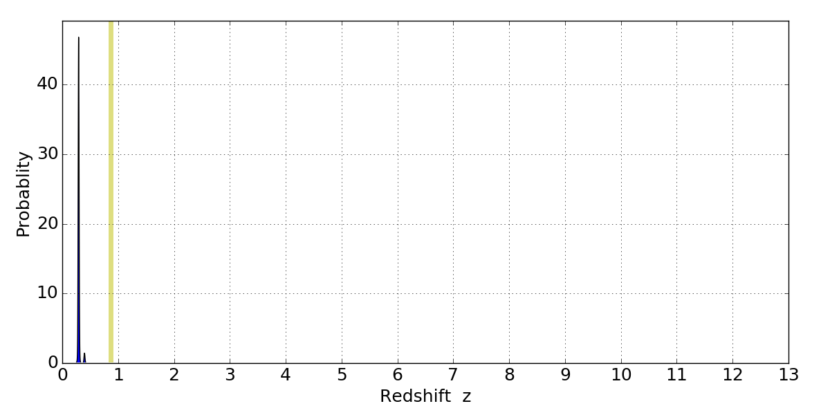 In P(z) plots: Yellow lines mark the cluster redshift z = 0.870,