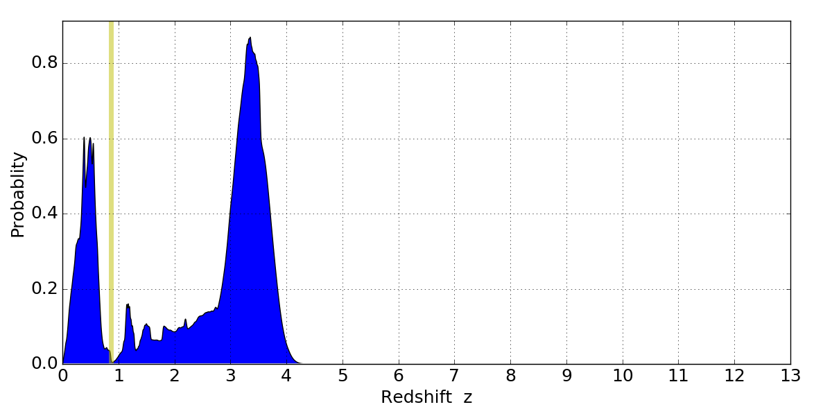 In P(z) plots: Yellow lines mark the cluster redshift z = 0.870,