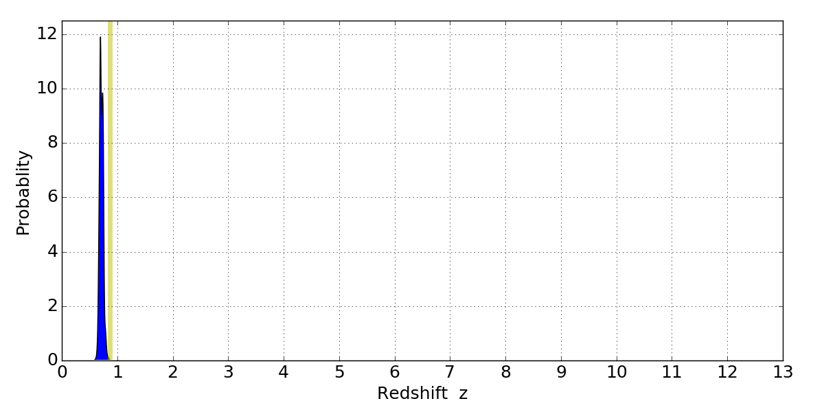 In P(z) plots: Yellow lines mark the cluster redshift z = 0.870,