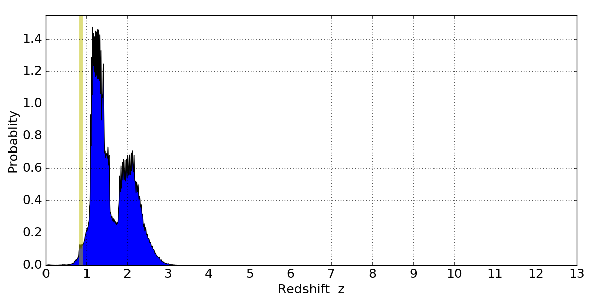 In P(z) plots: Yellow lines mark the cluster redshift z = 0.870,