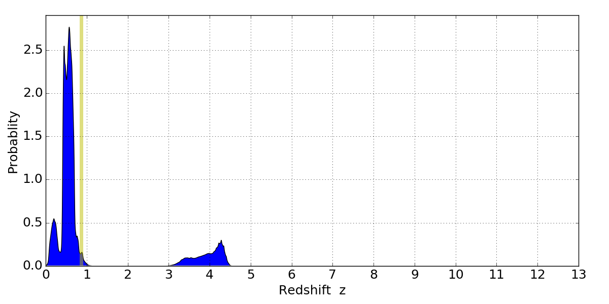 In P(z) plots: Yellow lines mark the cluster redshift z = 0.870,