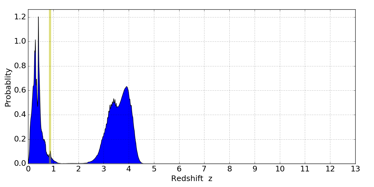 In P(z) plots: Yellow lines mark the cluster redshift z = 0.870,