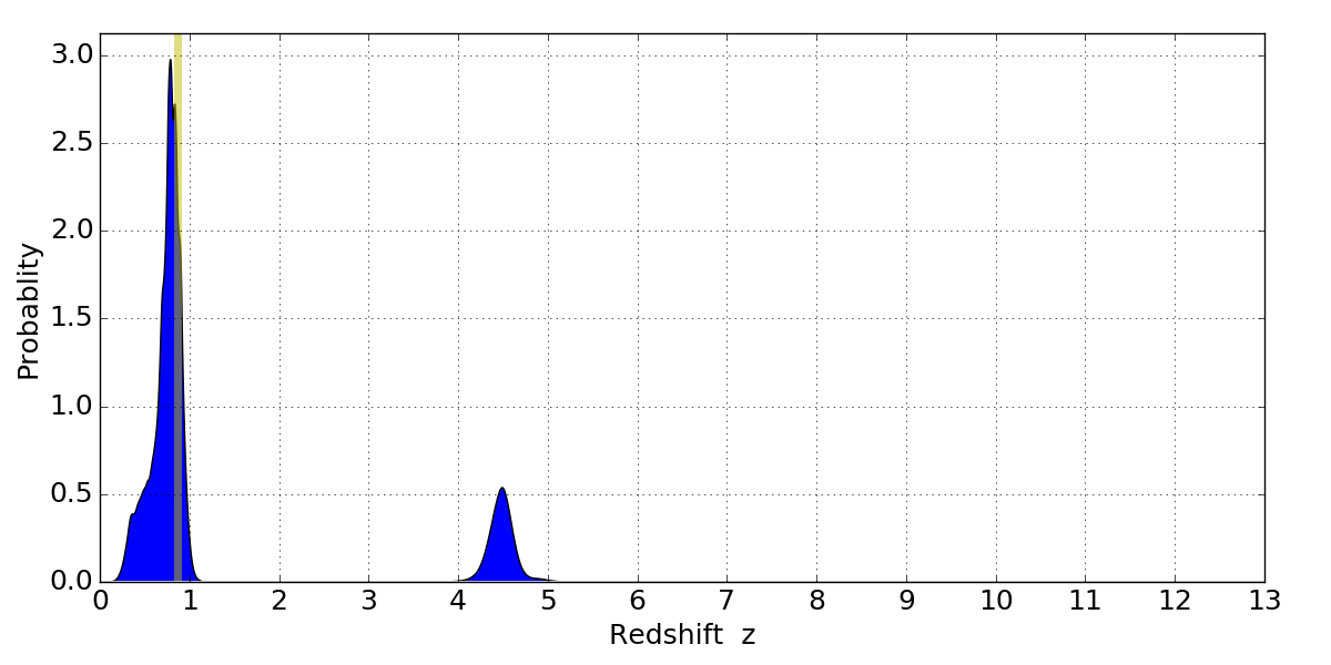 In P(z) plots: Yellow lines mark the cluster redshift z = 0.870,