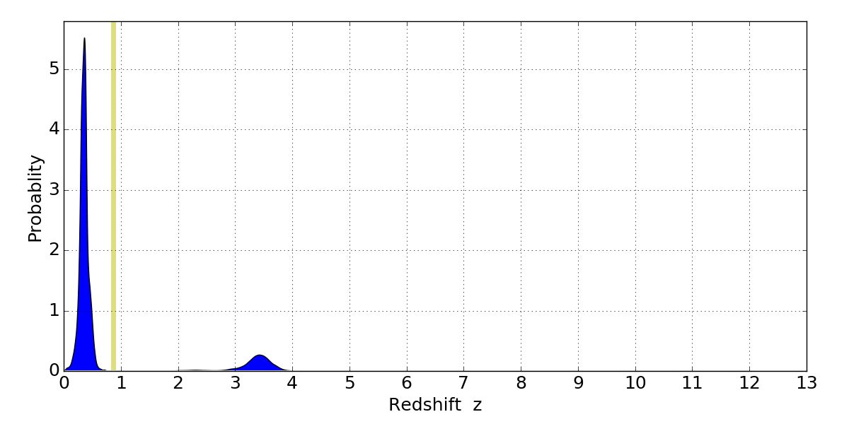 In P(z) plots: Yellow lines mark the cluster redshift z = 0.870,