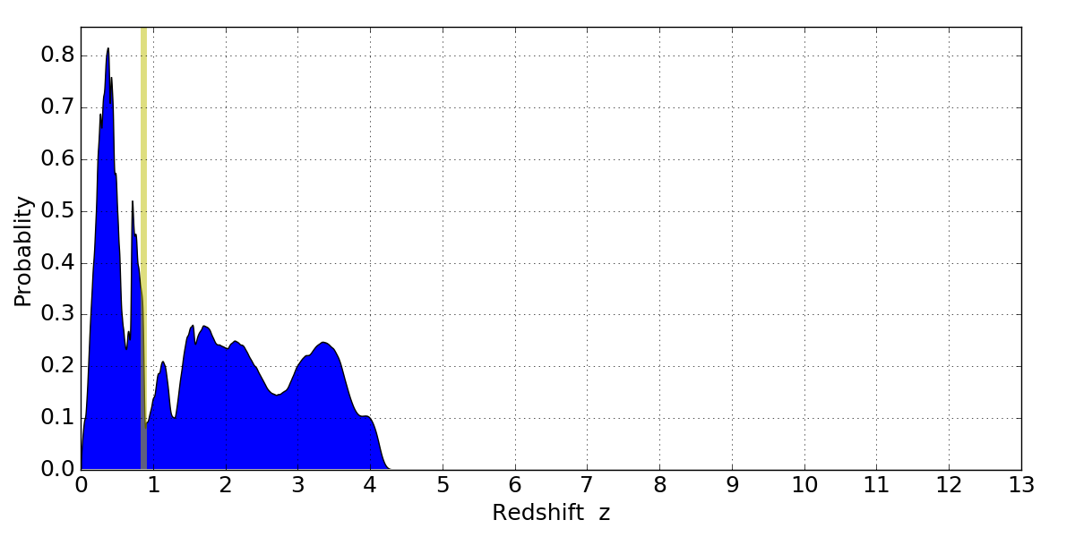 In P(z) plots: Yellow lines mark the cluster redshift z = 0.870,