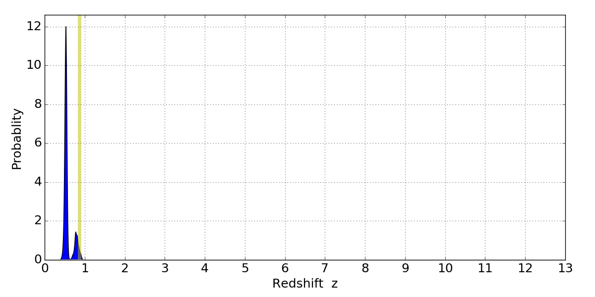 In P(z) plots: Yellow lines mark the cluster redshift z = 0.870,