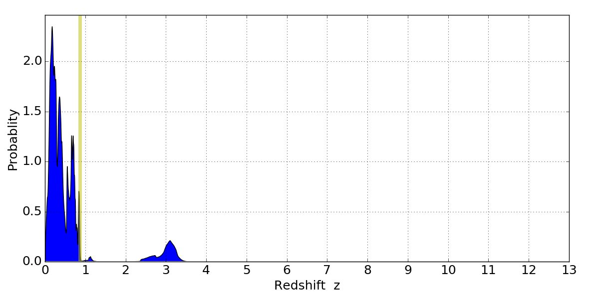 In P(z) plots: Yellow lines mark the cluster redshift z = 0.870,