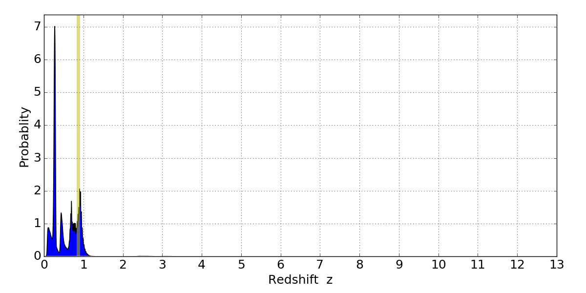 In P(z) plots: Yellow lines mark the cluster redshift z = 0.870,