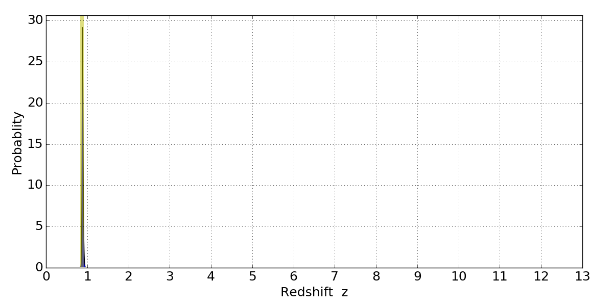 In P(z) plots: Yellow lines mark the cluster redshift z = 0.870,