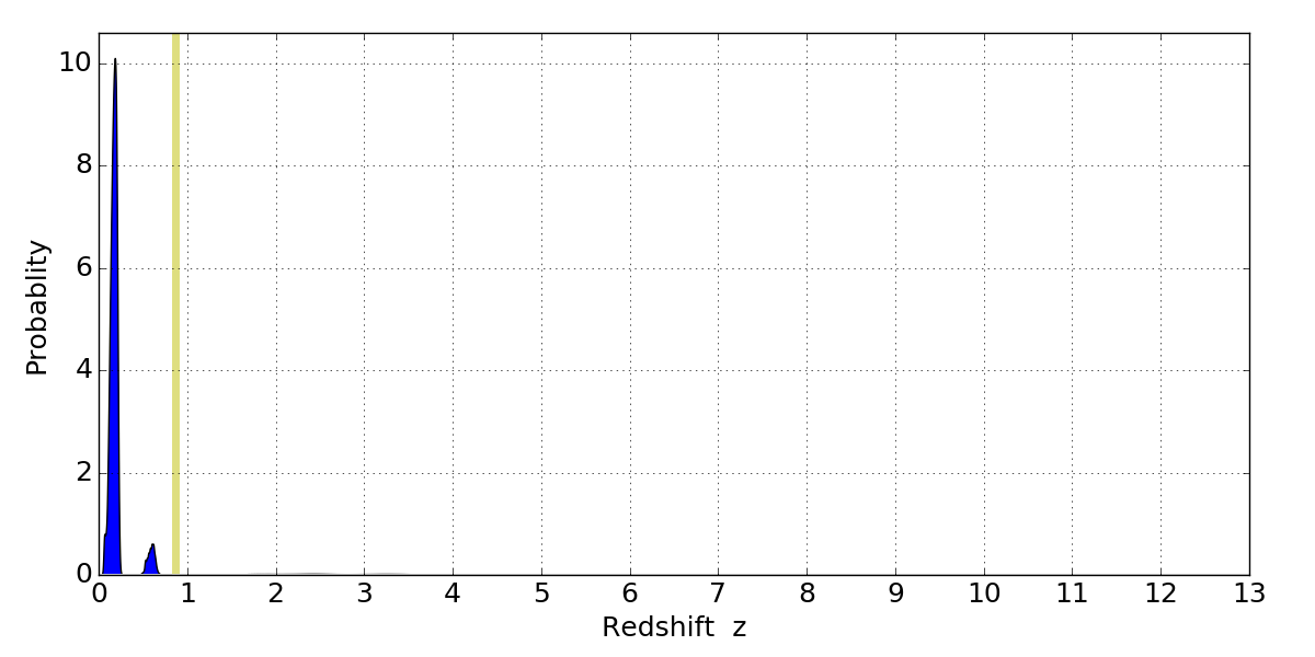 In P(z) plots: Yellow lines mark the cluster redshift z = 0.870,