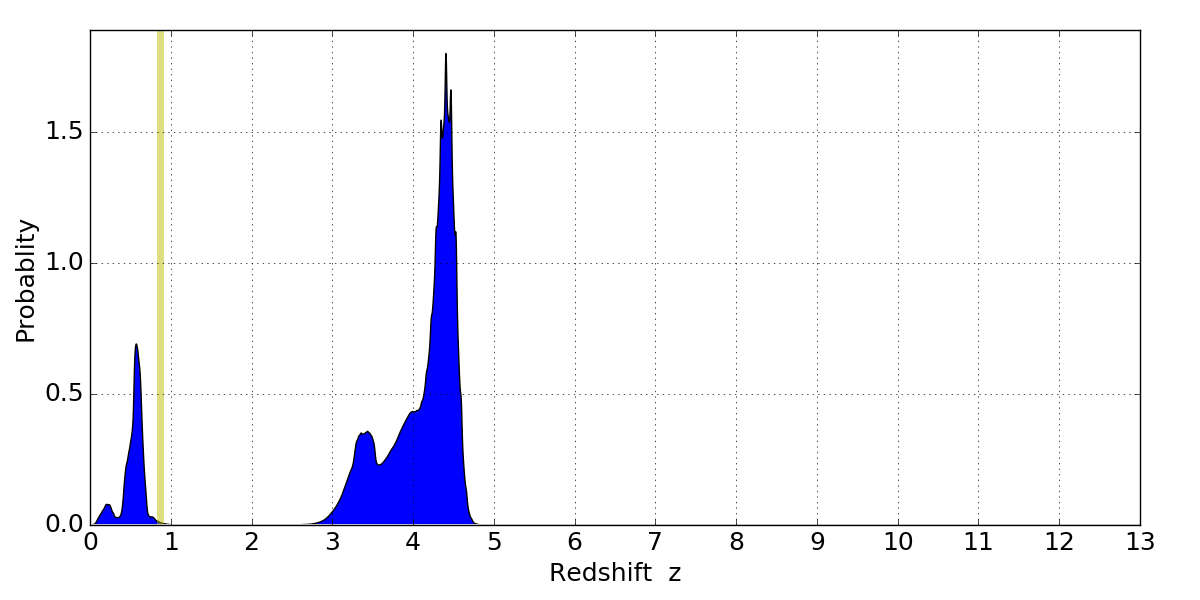 In P(z) plots: Yellow lines mark the cluster redshift z = 0.870,