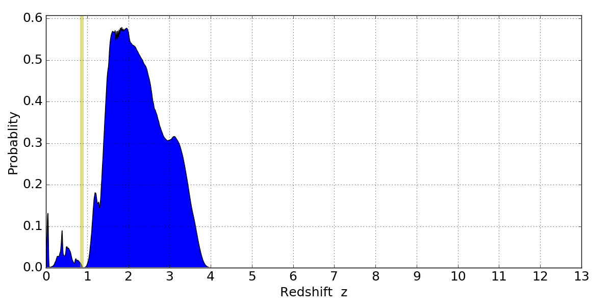 In P(z) plots: Yellow lines mark the cluster redshift z = 0.870,