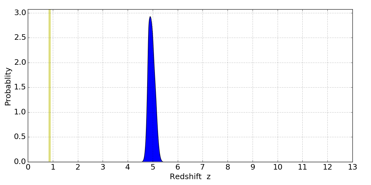 In P(z) plots: Yellow lines mark the cluster redshift z = 0.870,