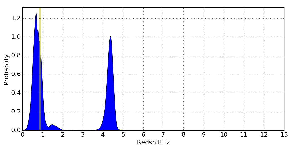 In P(z) plots: Yellow lines mark the cluster redshift z = 0.870,