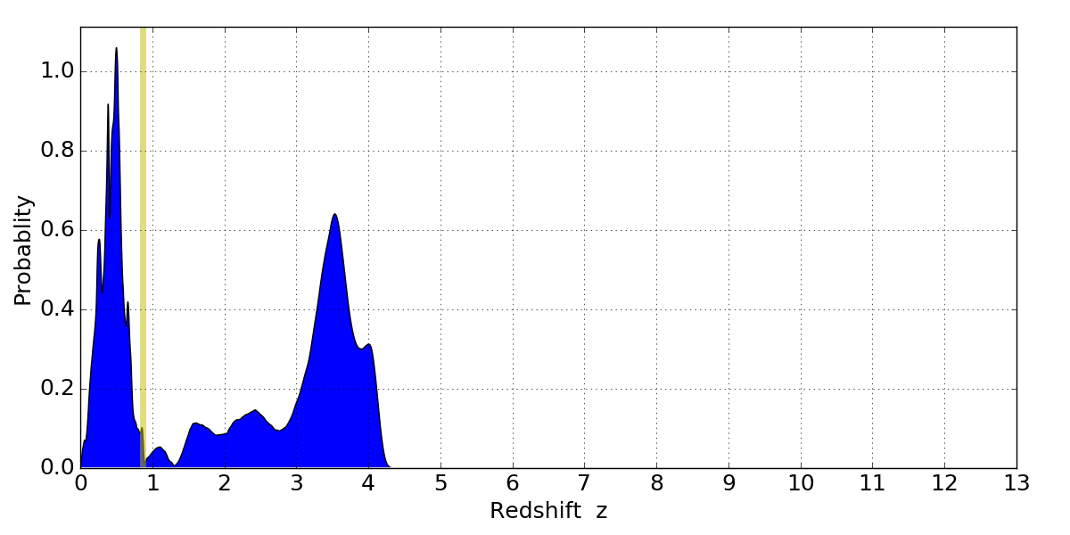 In P(z) plots: Yellow lines mark the cluster redshift z = 0.870,