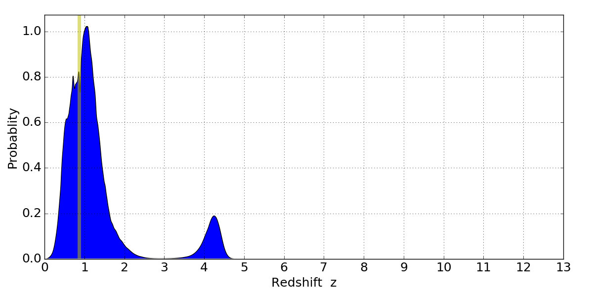 In P(z) plots: Yellow lines mark the cluster redshift z = 0.870,