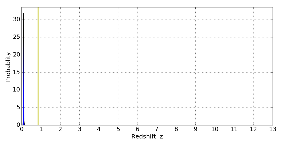 In P(z) plots: Yellow lines mark the cluster redshift z = 0.870,