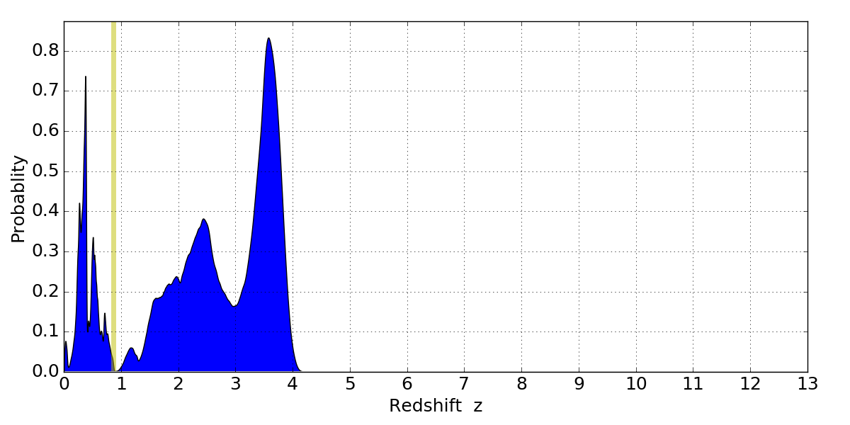 In P(z) plots: Yellow lines mark the cluster redshift z = 0.870,