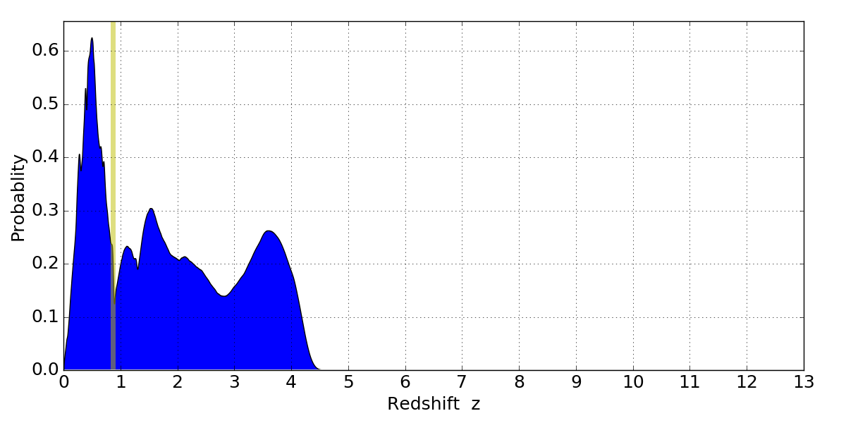 In P(z) plots: Yellow lines mark the cluster redshift z = 0.870,