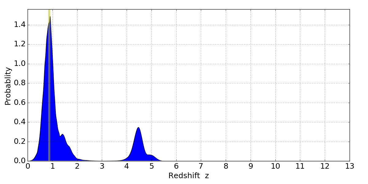 In P(z) plots: Yellow lines mark the cluster redshift z = 0.870,