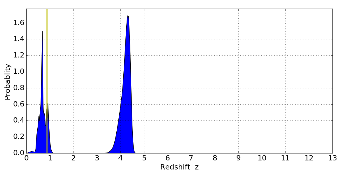In P(z) plots: Yellow lines mark the cluster redshift z = 0.870,