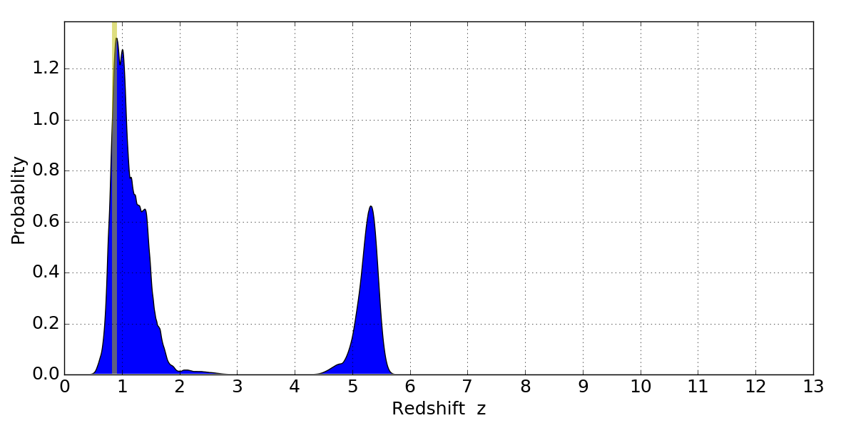 In P(z) plots: Yellow lines mark the cluster redshift z = 0.870,