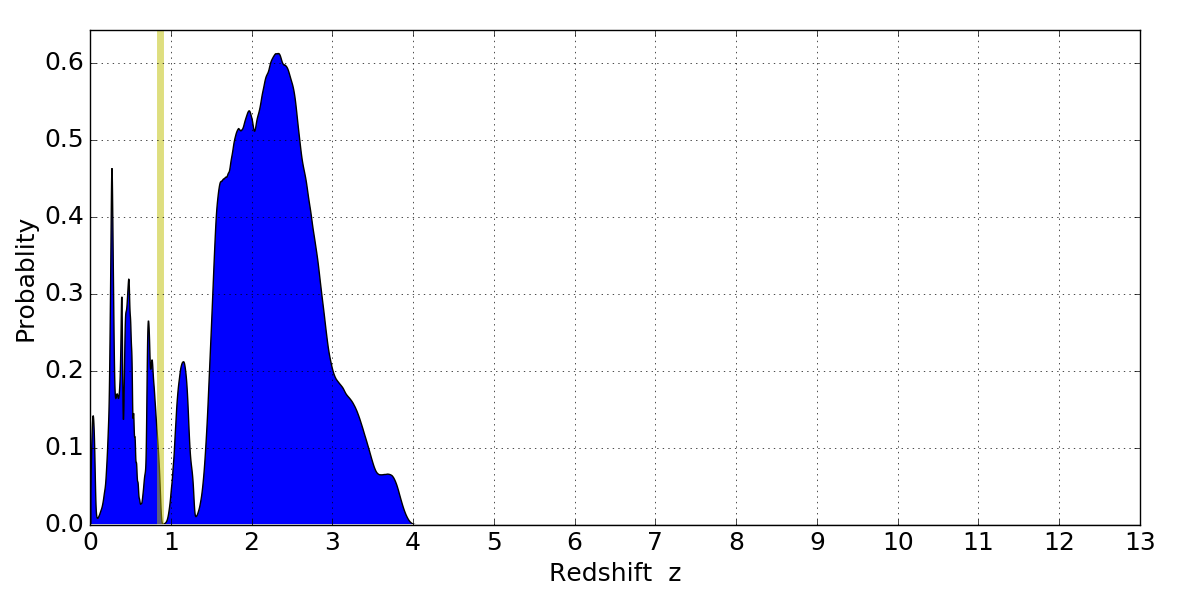 In P(z) plots: Yellow lines mark the cluster redshift z = 0.870,