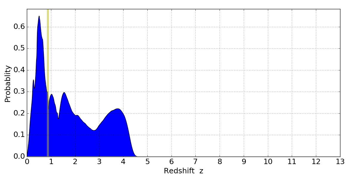 In P(z) plots: Yellow lines mark the cluster redshift z = 0.870,