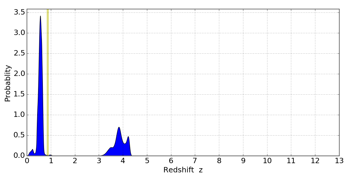 In P(z) plots: Yellow lines mark the cluster redshift z = 0.870,