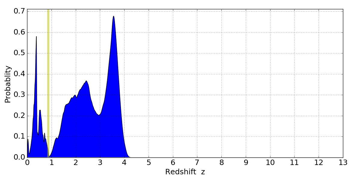 In P(z) plots: Yellow lines mark the cluster redshift z = 0.870,