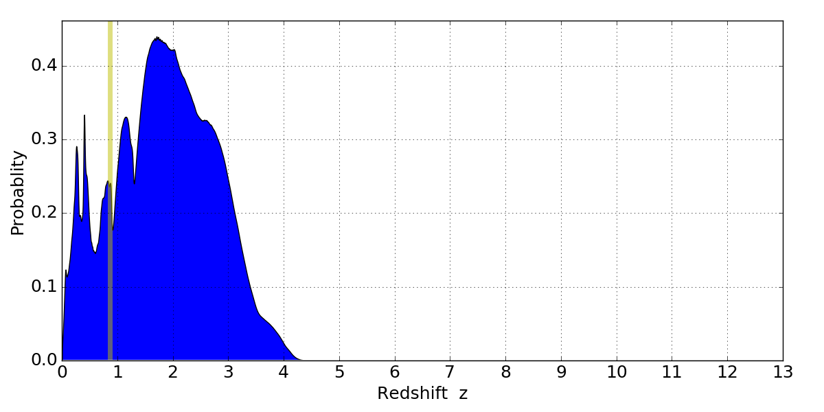 In P(z) plots: Yellow lines mark the cluster redshift z = 0.870,