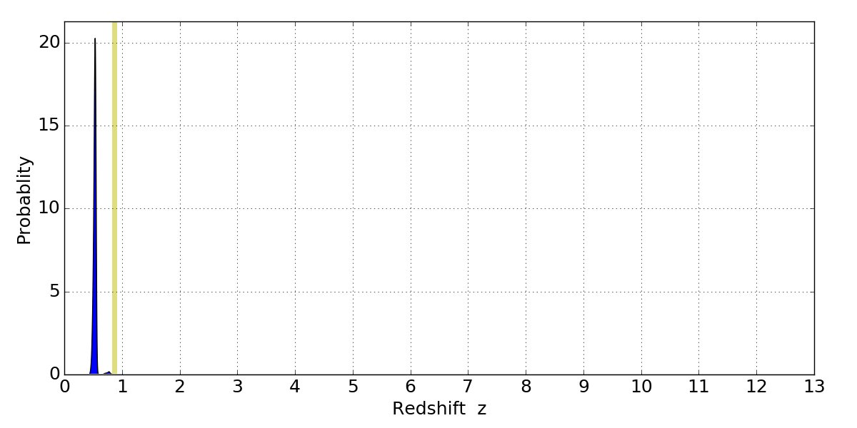 In P(z) plots: Yellow lines mark the cluster redshift z = 0.870,