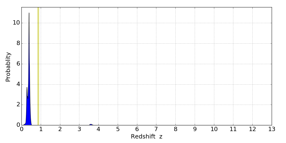 In P(z) plots: Yellow lines mark the cluster redshift z = 0.870,
