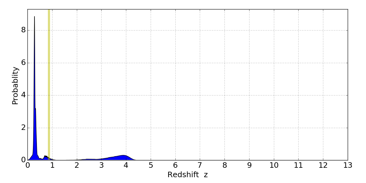 In P(z) plots: Yellow lines mark the cluster redshift z = 0.870,