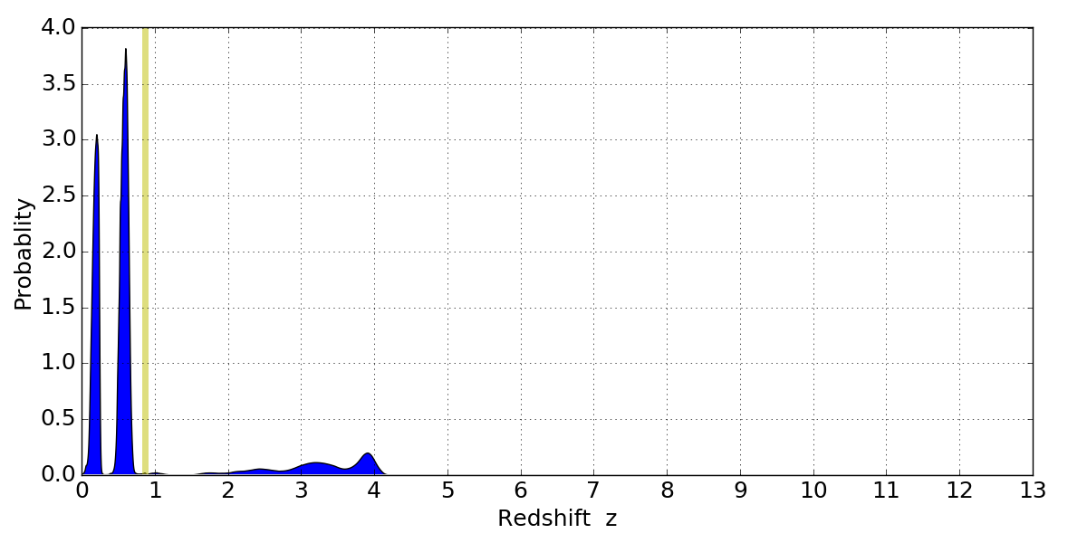 In P(z) plots: Yellow lines mark the cluster redshift z = 0.870,